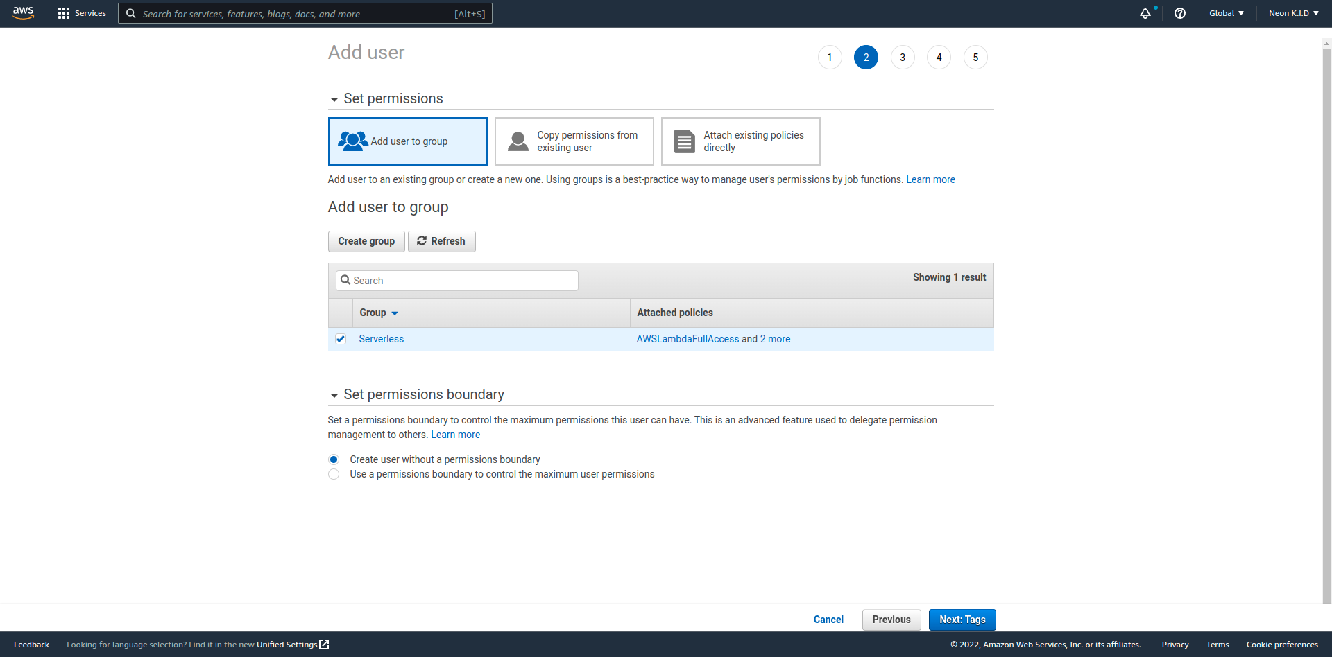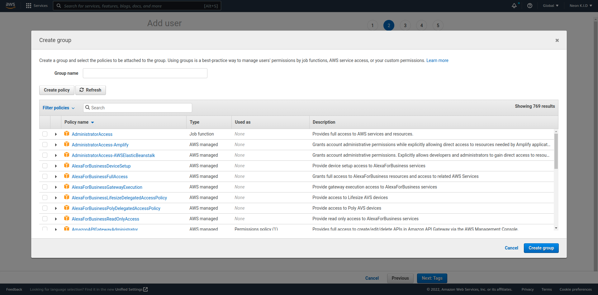 ๋ค์์ผ๋ก ๋์ด๊ฐ๋ฉด User Group์ ์ง์ ํด์ผ ํฉ๋๋ค. ์ฐ๋ฆฌ๋ ๋ง๋ค์ด๋ User Group์ด ์์ผ๋ฏ๋ก Create group์ ํตํด ์๋ก์ด ์ฌ์ฉ์ ๊ทธ๋ฃน์ ๋ง๋ค์ด์ค๋๋ค.
