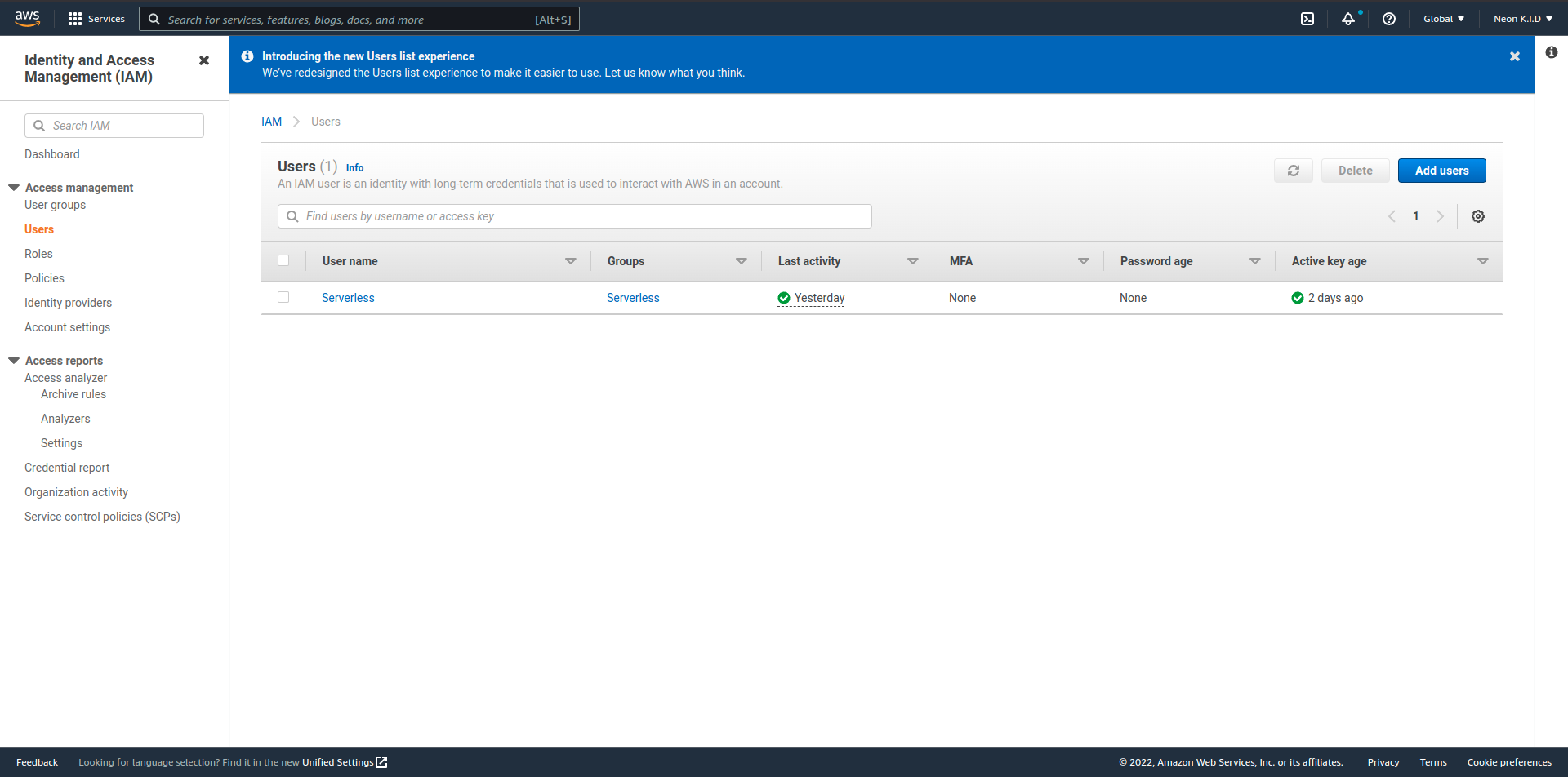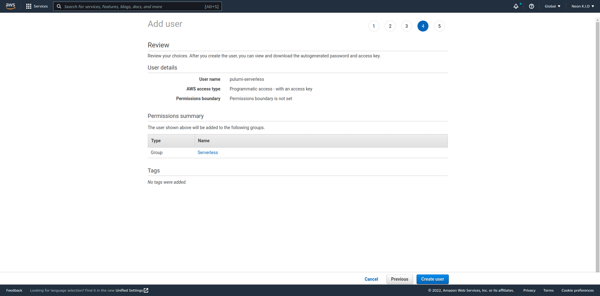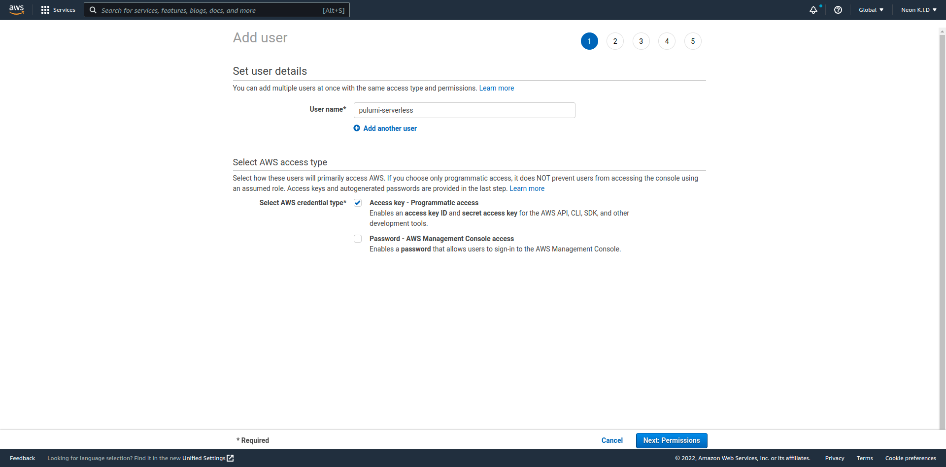 ๋จผ์ ๋ฐฐํฌ ๋๊ตฌ(Pulumi)๊ฐ AWS ๋ฆฌ์์ค๋ฅผ ์ด์ฉํด ์๋ฒ๋ฆฌ์ค ํ๊ฒฝ์ ๋ง๋ค์ด์ค ์ ์๋ ๊ถํ์ด ํ์ํฉ๋๋ค. AWS ์ฝ์์ ๋ก๊ทธ์ธ ํ ํ IAM์ ์ ์ํฉ๋๋ค.