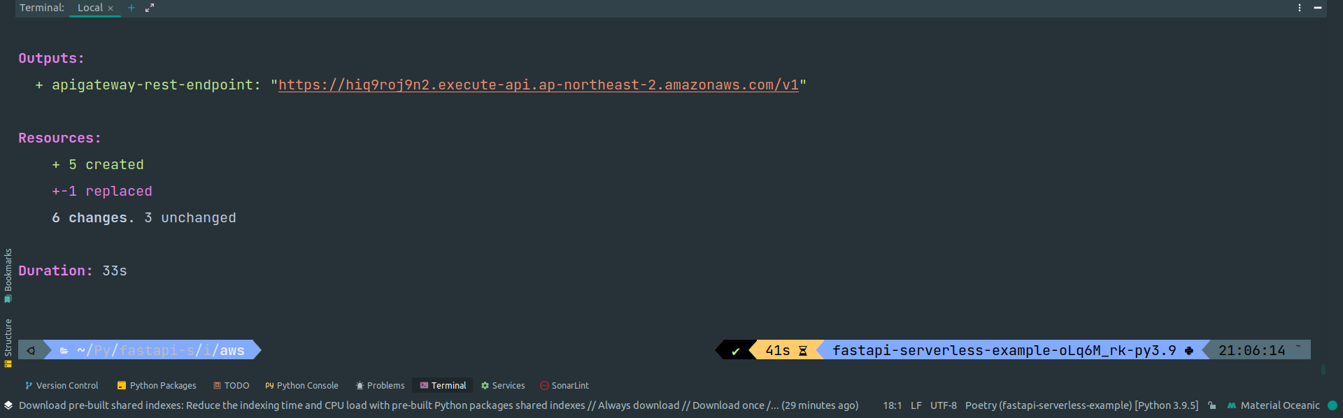 ์์ ๊ฐ์ด API Gateway ์๋ํฌ์ธํธ ์ฃผ์๊ฐ ์์ฑ์ด ๋์์ผ๋ฉด ์ ์์ ์ผ๋ก ์๋ฒ๋ฆฌ์ค ์คํ์ด ์์ฑ๋ ๊ฒ์ ๋๋ค.