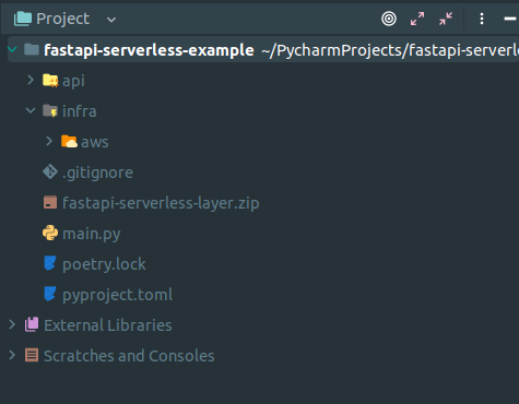 api ๋ฐ์ผ๋ก infra ๋๋ ํฐ๋ฆฌ๋ฅผ ๋ง๋ญ๋๋ค. ์ฐ๋ฆฌ๋ ์ฌ๊ธฐ์ AWS๋ฅผ ์ฌ์ฉํ ๊ฒ์ด๋ฏ๋ก AWS ํด๋๋ฅผ ํ ๊ฐ ๋ ์ถ๊ฐํฉ๋๋ค. ๊ทธ๋ฆฌ๊ณ ์ด์ ๊ธ์์ ๋ง๋ค์ด๋์๋ ํ๋ก์ ํธ ๋ชจ๋ ์์ถ ํ์ผ์ fastapi-serverless-layer.zip ์ด๋ฆ์ผ๋ก ์์ ํ ํ ์ต์์ ๋๋ ํฐ๋ฆฌ์ ์ด๋์ํต๋๋ค.