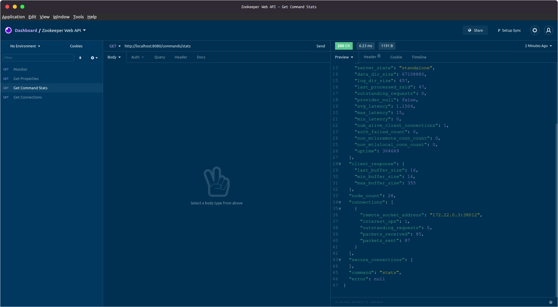 GET commands/stats๋ฅผ ํธ์ถํ๋ฉด ์๋ฒ ์ํ์ ์ฐ๊ฒฐ๋ ๋ ธ๋๋ค์ ์ ๋ณด๋ฅผ ๋ณผ ์ ์์ต๋๋ค. connections ํญ๋ชฉ์ ์๊น ์ฐ๋ฆฌ๊ฐ ๋์ ๋ ์นดํ์นด๊ฐ ์ฐ๊ฒฐ๋ ์ ๋ณด๋ฅผ ๋ณผ ์ ์์ต๋๋ค.