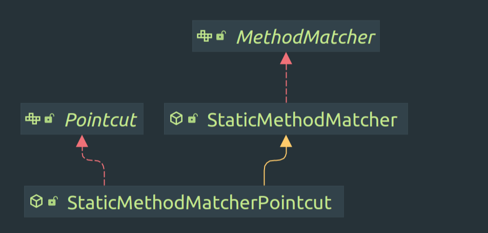 StaticMethodMatcherPointcut ํด๋์ค๋ MethodMatcher ์ธํฐํ์ด์ค๋ฅผ ๊ตฌํํ๋ ์ถ์ ํด๋์ค์ธ StaticMethodMatcher ํด๋์ค๋ฅผ ์์ํ๋ฏ๋ก matches ๋ฉ์๋๋ฅผ ๊ตฌํํด์ผ ํฉ๋๋ค.