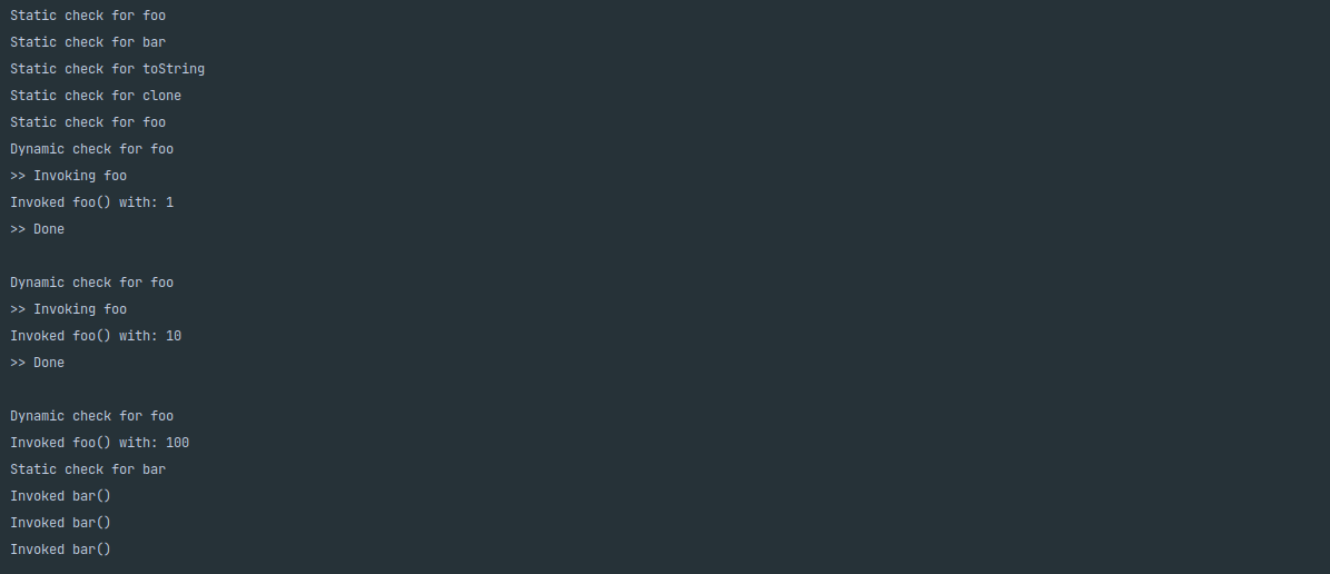 ์คํ ๊ฒฐ๊ณผ๋ฅผ ๋ณด๋ค์ํผ ์ฒ์ ๋ ๋ฒ์ foo() ๋ฉ์๋ ํธ์ถ์๋ง ์ด๋๋ฐ์ด์ค๊ฐ ์ ์ฉ๋์์ผ๋ฉฐ ์ฒ์์๋ ๋จผ์ ์ ์ ๊ฒ์ฌ๊ฐ ์ํ๋ ๊ฒ์ ๋ณผ ์ ์์ต๋๋ค. (์ฐ๋ฆฌ๊ฐ ์ง์ ๊ตฌํํ์ง ์์๋ ๊ธฐ๋ณธ์ ์ธ Object ๋ฉ์๋๋ค๊น์ง ์ ๋ถ...)