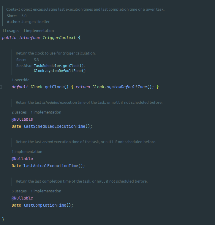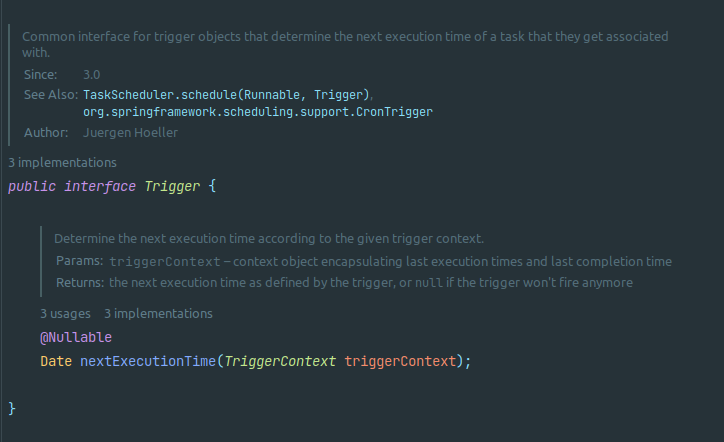 ์ฝ๋๋ฅผ ์ ์ ์ดํด๋ณด๋ฉด nextExecutionTime ๋ฉ์๋ ๋ถ๋ถ์ TriggerContext๋ฅผ ์ธ์๋ก ๋ฐ๋ ๋ถ๋ถ์ด ์์ต๋๋ค. ์ด Context๋ฅผ ์ด์ฉํด ๊ตฌํ์ฒด์ ์ฐธ๊ณ ํ๋ฉด ๋ฉ๋๋ค.