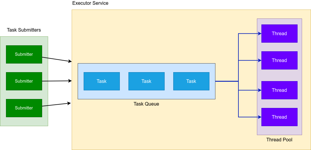 TaskExecutor ์ ๊ธฐ๋ณธ ๊ตฌ์กฐ๋ ์์ ๊ฐ์ต๋๋ค. ์ฐ๋ฆฌ๊ฐ ํ๊ณ ์ ํ๋ ์์ ์ ๋ฐ์๋ค์ด๋ Submitter, ๊ทธ๋ฆฌ๊ณ ๊ทธ ์์ ์ ์คํํ ์ค์ ์์ ์ Task, ๊ทธ ์์ ์ ์คํํ Thread๋ก ๊ตฌ์ฑ๋์ด ์์ต๋๋ค.