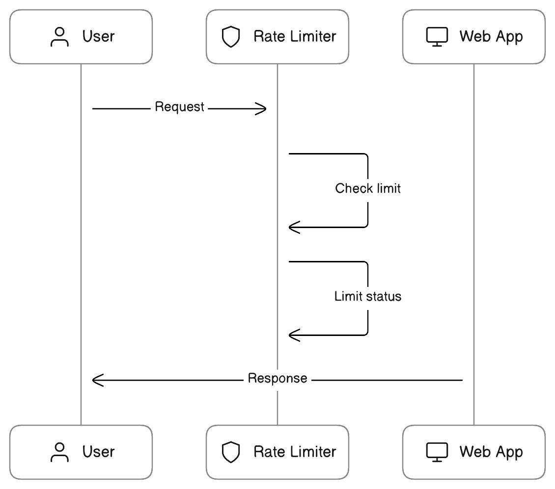 ์ข ๋ ์ดํด๊ฐ ์ฝ๊ฒ ๋๋๋ก ์ํ์ค ๋ค์ด์ด๊ทธ๋จ์ผ๋ก ์ค๋ช ํด๋ณด์๋ฉด, ์ฌ์ฉ์๊ฐ HTTP API ํธ์ถ์ ๋ ๋ฆฌ๋ฉด Rate Limiter๊ฐ ์ด ์์ฒญ์ ๋์ ๋ฐ์ ์์ฒญ ํ์๊ฐ ์ ํ๋์ด ์๋์ง๋ฅผ ํ์ธํ ํ ์ ํ ํ์๋ฅผ ์ด๊ณผํ์ง ์์๋ค๋ฉด ์ ํ๋ฆฌ์ผ์ด์ ์ด ์๋ตํ๊ณ , ๊ทธ๋ ์ง ์๋ค๋ฉด Rate Limiter๊ฐ ํ์ฌ ์ํ๋ฅผ ์๋ตํ๋ ๊ตฌ์กฐ์ ๋๋ค.