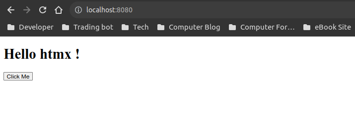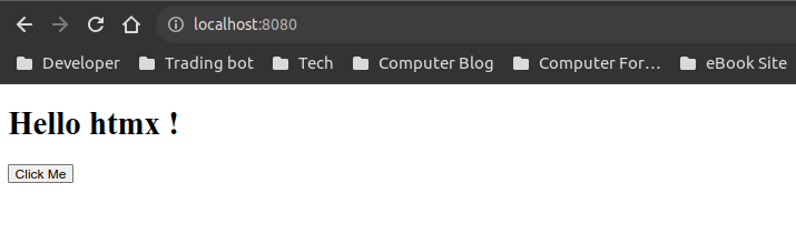 script ํ๊ทธ๋ฅผ ์ด์ฉํ์ฌ htmx ์คํฌ๋ฆฝํธ๋ฅผ ์ถ๊ฐํ๋ฉด ์ฑ๊ณต์ ์ผ๋ก ์ ์ฉ์ด ์๋ฃ๋์์ผ๋ฉฐ ํ ์คํธ๋ฅผ ์ํด ์ํ API๋ฅผ ํ ๊ฐ ๋ง๋ค๊ณ , ํ๋ฉด์ ๋ฒํผ์ ์ถ๊ฐํ์ฌ ๋ฒํผ์ ํด๋ฆญํ์ ๋, It works ! ํ๋ฉด์ Hello htmx ! ๋ผ๋ ๋ฌธ๊ตฌ๋ก ๋ฐ๊พธ์ด๋ณด๊ฒ ์ต๋๋ค.