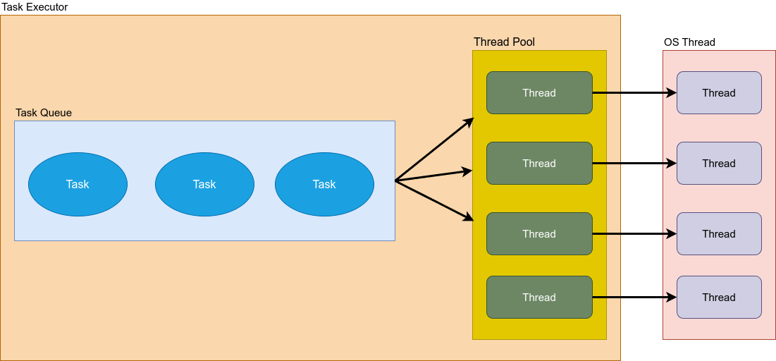 ํ๋ซํผ ์ค๋ ๋๋ TaskExecutor ์ธํฐํ์ด์ค๋ฅผ ์ฌ์ฉํ์ฌ ์ค๋ ๋ ํ(Thread Pool)์ ์ฌ์ฉํ์ฌ ์ฌ์ฉํ๋ค๊ณ ๊ฐ์ ํ์ ๋ ํ๋์ ํ์คํฌ๋น ํ๋์ ์ค๋ ๋๋ฅผ ํ ๋นํ์ฌ ์์ ํ๊ฒ ๋ฉ๋๋ค. ์์๋ค์ํผ ํ๋ซํผ ์ค๋ ๋๋ ๊ธฐ์กด์ Thread API๋ก, ์ด์์ฒด์ ์ค๋ ๋๋ฅผ ๊ทธ๋๋ก ์ฌ์ฉํ๊ธฐ ๋๋ฌธ์ ๋ง์ ๋น์ฉ์ด ๋ฐ์ํฉ๋๋ค.