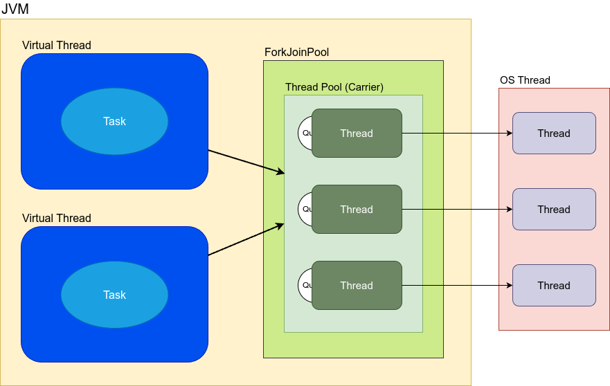 ๊ฐ์ ์ค๋ ๋์์๋ ์ด๋ฅผ ๊ฐ์ ํ๊ธฐ ์ํด ํ๋ซํผ ์ค๋ ๋๋ฅผ ์บ๋ฆฌ์ด ์ค๋ ๋(Carrier Thread)๋ก ์ ์ํ์ฌ ๋ด๋ถ์ ์ผ๋ก ์ฌ์ฉํ๋ ๋จ์ผ ํ๋ซํผ ์ค๋ ๋์ ๊ทธ ์ฉ์ด๋ฅผ ๋ถ๋ฆฌํ์ต๋๋ค. ๋ฐ๋ผ์ VirtualThreadBuilder ๊ฐ์ฒด๊ฐ ์์ ์ ๋ฐ์์ ๋ ๊ฐ์ ์ค๋ ๋ ๊ฐ์ฒด๋ฅผ ์์ฑํ๊ณ , ํด๋น ์ค๋ ๋๊ฐ ๊ฐ์ง๊ณ ์๋ ์์ ์ ForkJoinPool์ด๋ผ๋ ์บ๋ฆฌ์ด ์ค๋ ๋ ํ์ด ๋ฐ์ ๊ฐ ์บ๋ฆฌ์ด ์ค๋ ๋์ ํ ๋นํ๋ ๋ฐฉ์์ ๋๋ค.