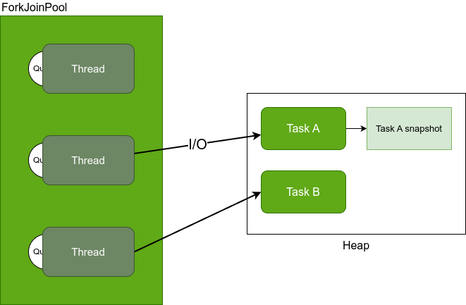 ๊ฐ์ ์ค๋ ๋๋ ์ฌํ ์ค๋ ๋์ ๋ง์ฐฌ๊ฐ์ง๋ก JVM์ ํ(Heap) ์์ญ์ ์ ์ฅ๋ฉ๋๋ค. ํ์์ญ์ ์ ์ฅ๋์์ ๋๋ ์์ ์ด ์งํ ์ค์ธ ์ํ๋ก ์งํ ์ค์ ์ฌ์ฉํ ํจ์ ํธ์ถ ์ ๋ณด, ๋ณ์ ์ ๋ณด ๋ฑ์ด ์ฌ๊ธฐ์ ๋ด๊ธฐ๊ฒ ๋๊ณ , I/O blocking์ด ๋ฐ์ํ๋ฉด ์ด๋ค์ ์์ ํ๋ ์คํ ํ๋ ์(stack frames)์ ๋ณ๋์ ํ ์์ญ์ ์์๋ก ๋ณต์ฌํด๋๋ค๊ฐ ์บ๋ฆฌ์ด ์ค๋ ๋๊ฐ ๋ค๋ฅธ ์์ ์ํ์ ์ฌ์ฉํ ์ ์๋๋ก ํฉ๋๋ค. ์ด๋ฌํ ์์ ์ Mount/Unmount ์์ ์ด๋ผ ํฉ๋๋ค.