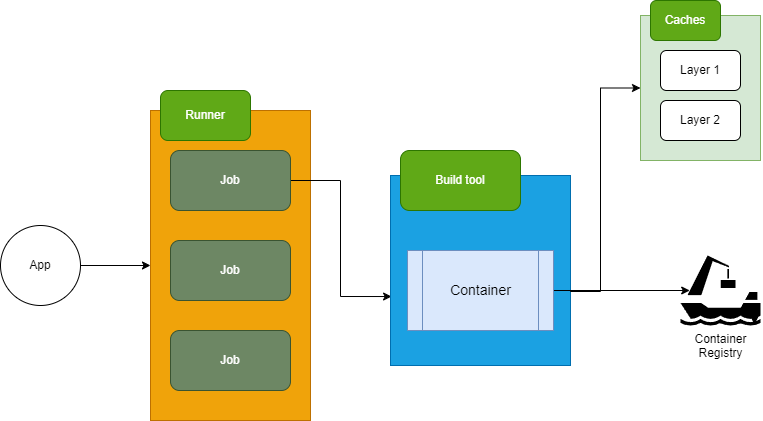 ํ์์ ์์ค ์ฝ๋๋ฅผ ์ฌ๋ฆฐ ๋ค, ํ์ค ํ๊ฒฝ์์ ํ ์คํธ๋ฅผ ๋ง์น ํ ๋ฐฐํฌ ์ด๋ฏธ์ง๋ก ๋น๋ํ๋ ๊ฒฝ์ฐ ์์ ๊ฐ์ด ๋ณ๋์ ์๋ฒ๋ฅผ ์ฌ์ฉํ์ฌ ๋น๋ํ ์ ์์ต๋๋ค. ๊ฐ๋ น Github Actions ๋ด์ง Gitlab Runner์ ๊ฒฝ์ฐ, CI/CD์ฉ ์๋ฒ๊ฐ ์กด์ฌํ๊ณ ํ์ ๊ด๋ฆฌ ์์คํ ์์ ์ด๋ฒคํธ ๋ฐ์์ ์ปจํ ์ด๋ ์ด๋ฏธ์ง ๋น๋๋ฅผ ์ํ ์ธ์คํด์ค๊ฐ ์์ฑ๋๋๋ฐ, ์ด ๋ ์ธ์คํด์ค๊ฐ ์์ฑ๋ ํ์๋ ํด๋น ์ธ์คํด์ค๋ ์๋ฉธ๋์ด ์์ด์ง๊ธฐ ๋๋ฌธ์ ๋ฉ๋ชจ๋ฆฌ์ ๋น๋ ์บ์๋ฅผ ์ฃผ์ ํ๋ ๊ฑด ๋ฌด์๋ฏธํ๋ฏ๋ก ๋ณ๋์ ์๊ฒฉ ์ ์ฅ์์ ๋น๋ ์บ์๋ฅผ ์ ์ฌํด์ผ ํฉ๋๋ค.